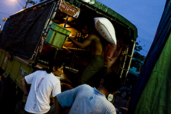 Magna tým nakládá základní potraviny do nákladních aut, které jsme vypravili na pomoc obětem cyklonu Nargis na jihu od města Laputta.